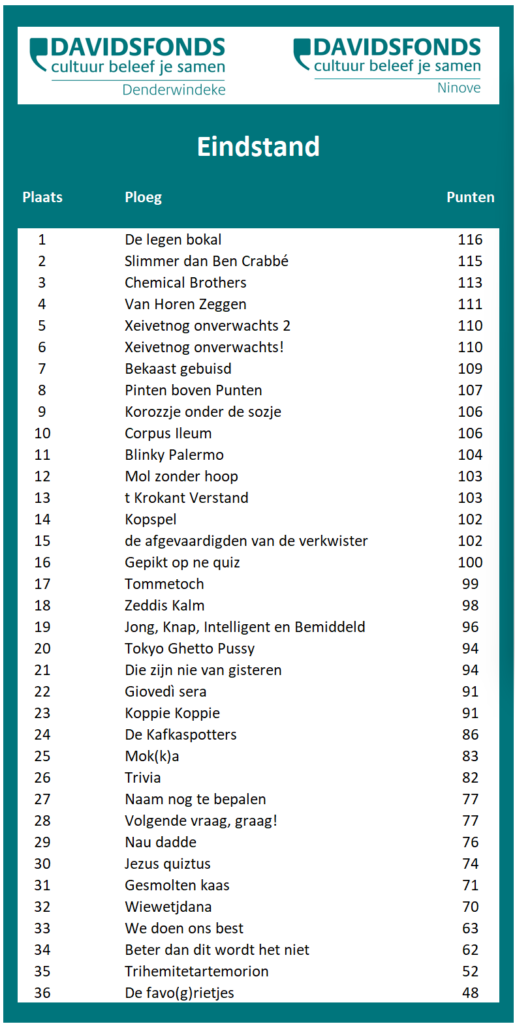 En dit is de einduitslag, spannend met één puntje verschil gewonnen door De Legen Bokal.